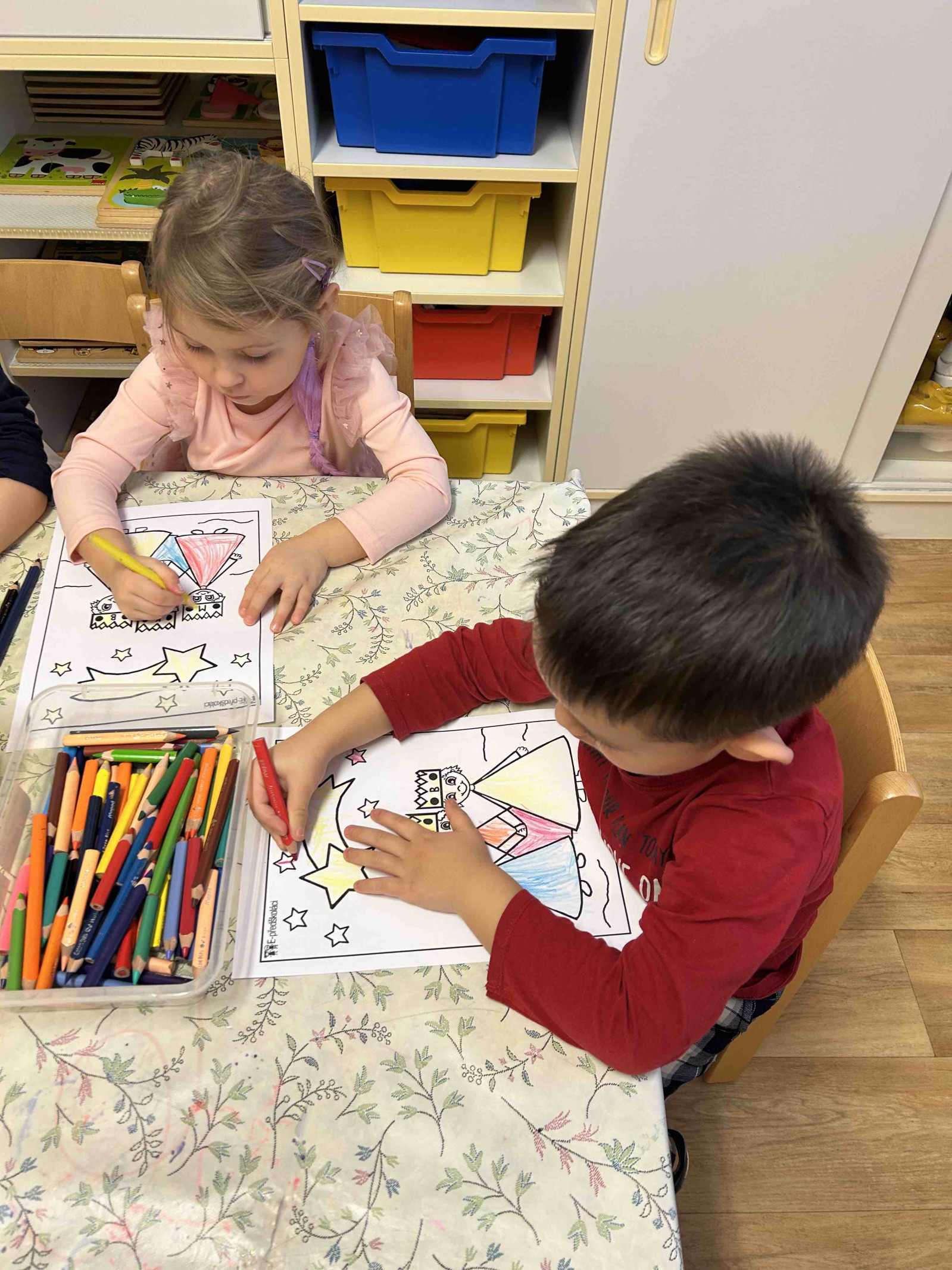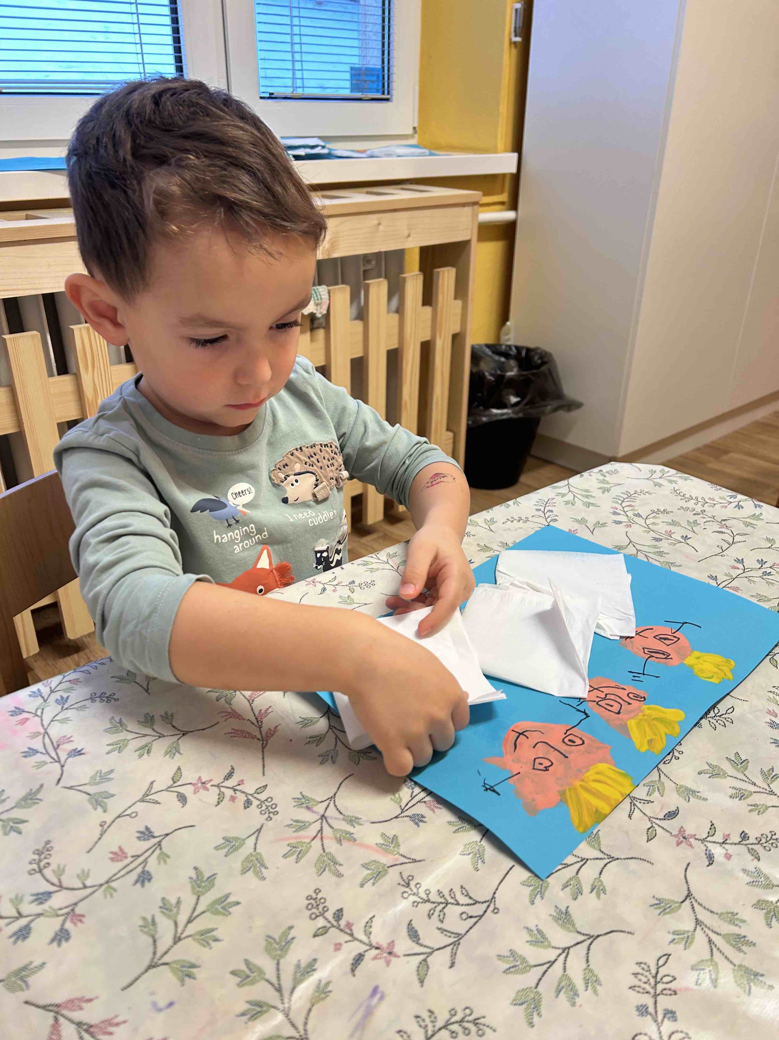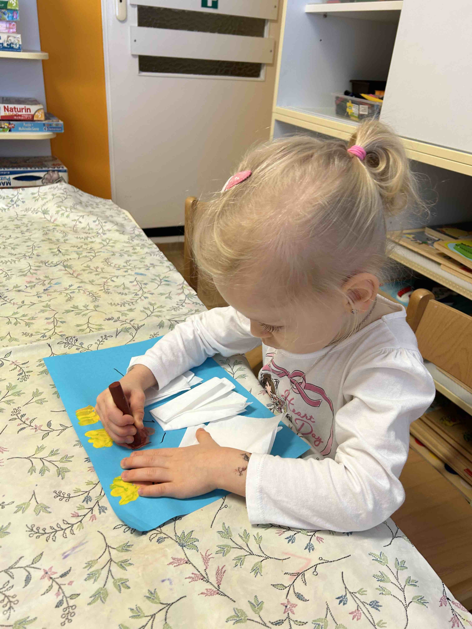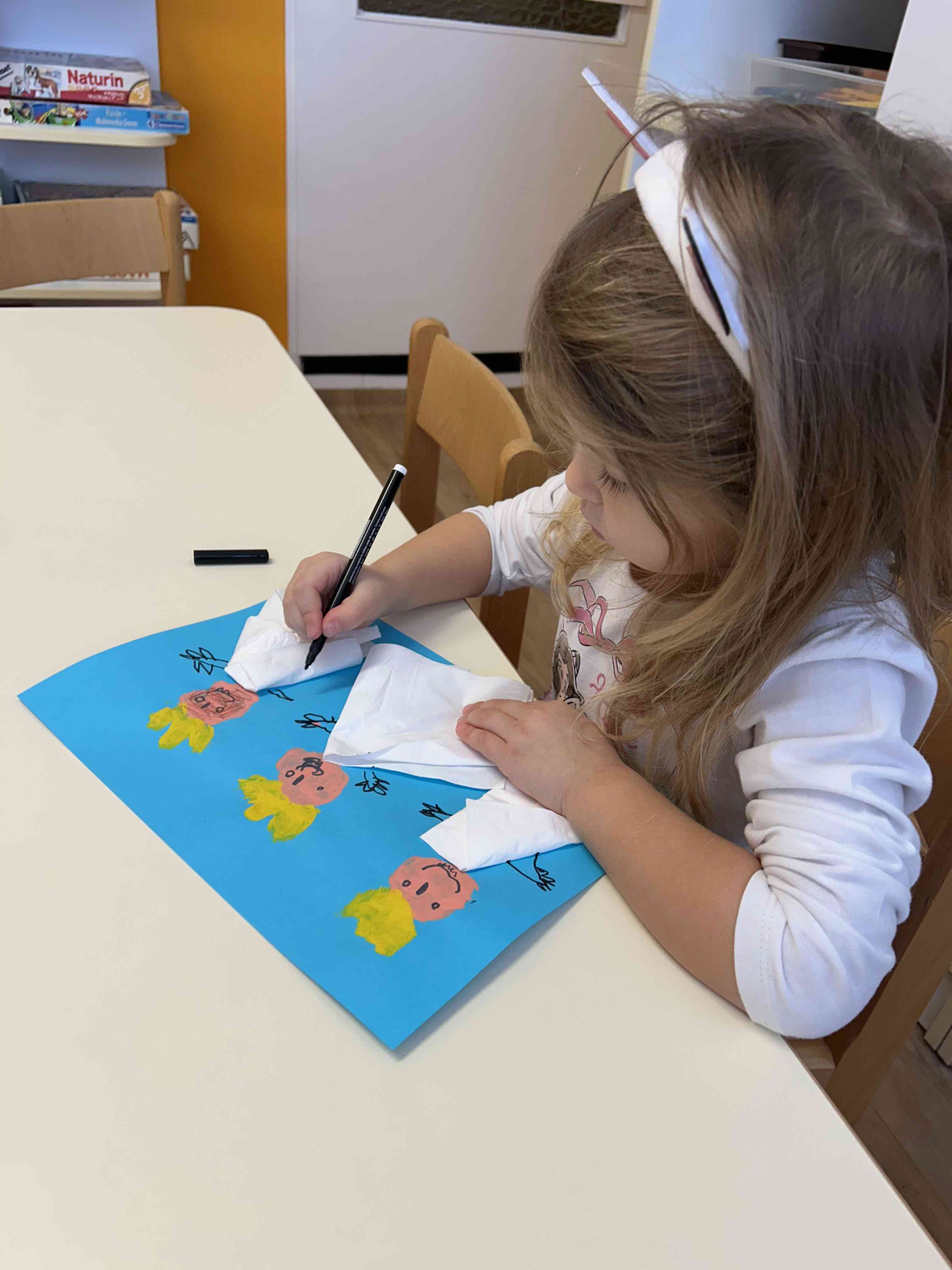 - děti malovaly temperovými barvami hlavy a koruny Třem králům, po té dokreslily detaily obličeje a ruce černým fixem a dolepily šaty z papírových kapesníčků