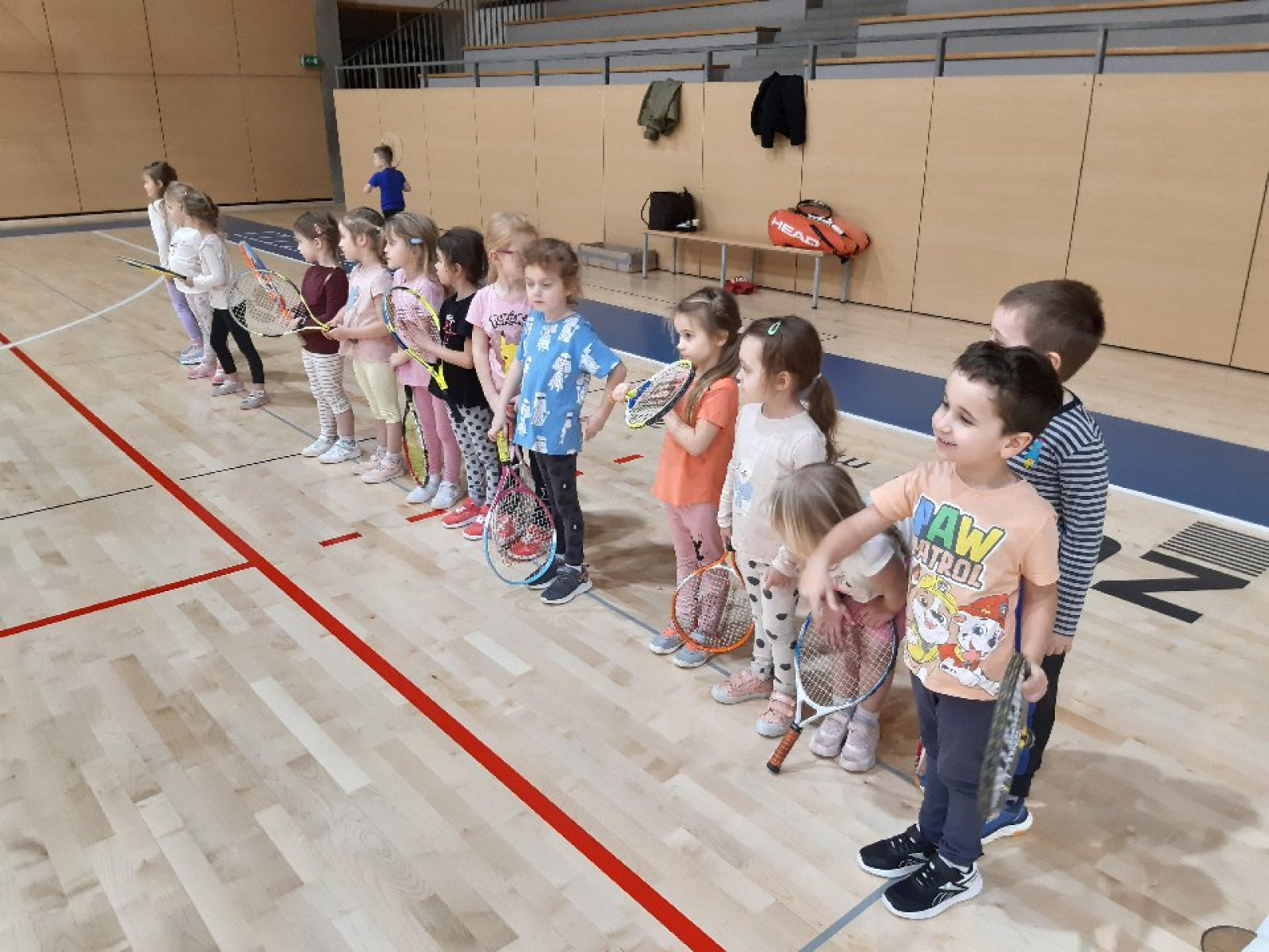 - trénink ve sportovní hale byl zaměřen na tenis (manipulace s raketou a míčkem, rozcvička, PH Mrazík, nácvik tenisového úderu forhend)