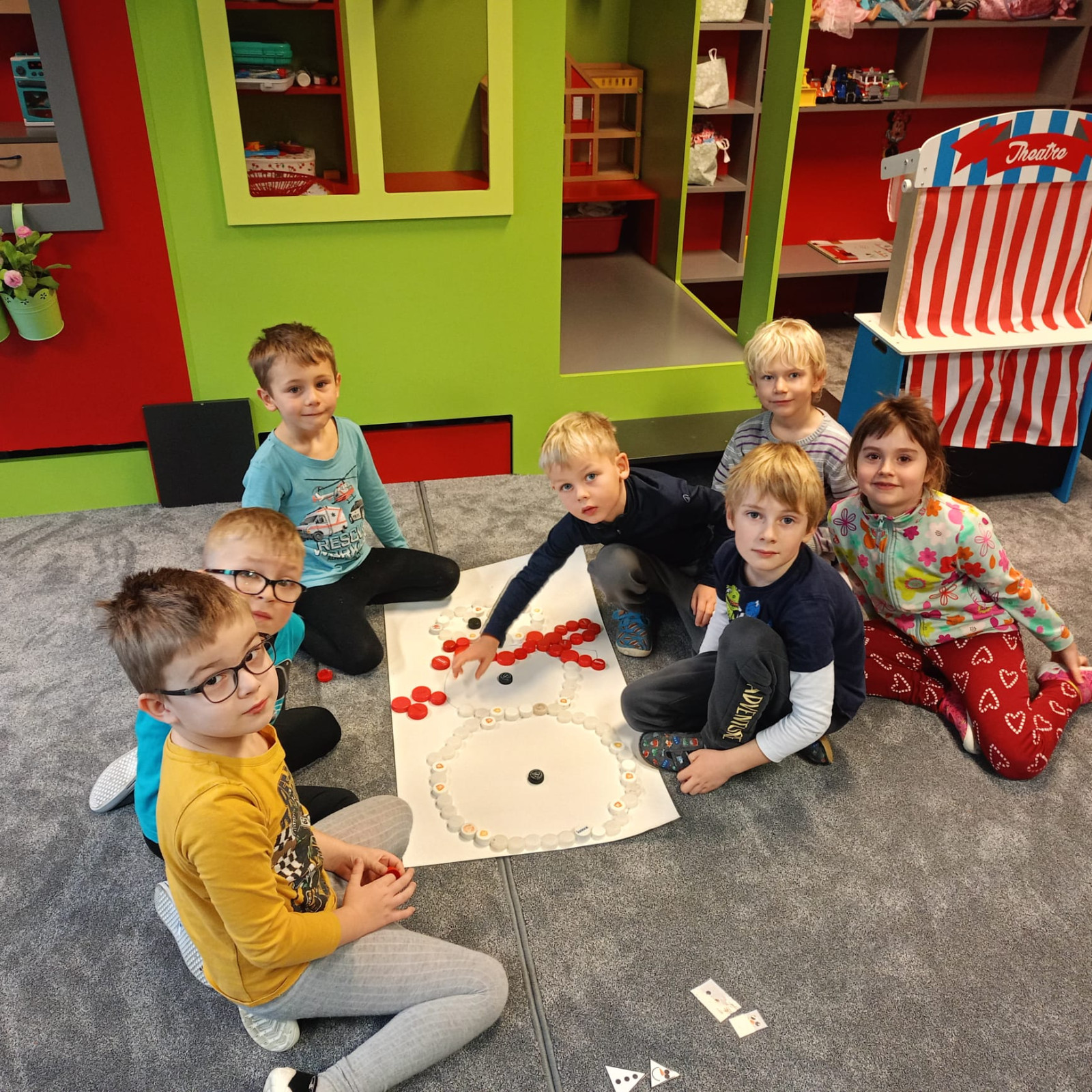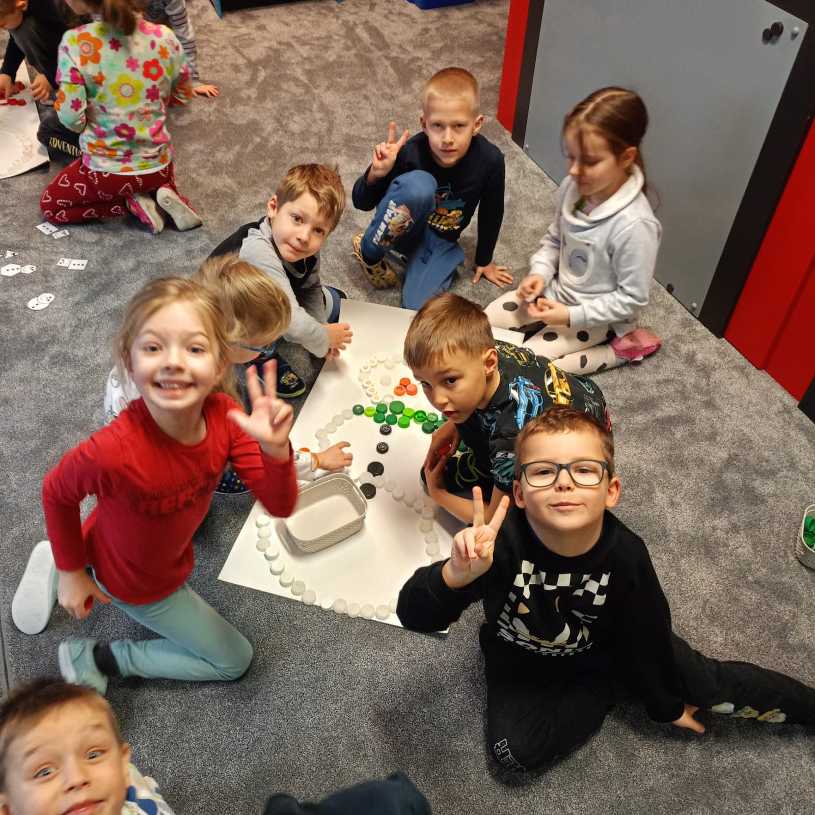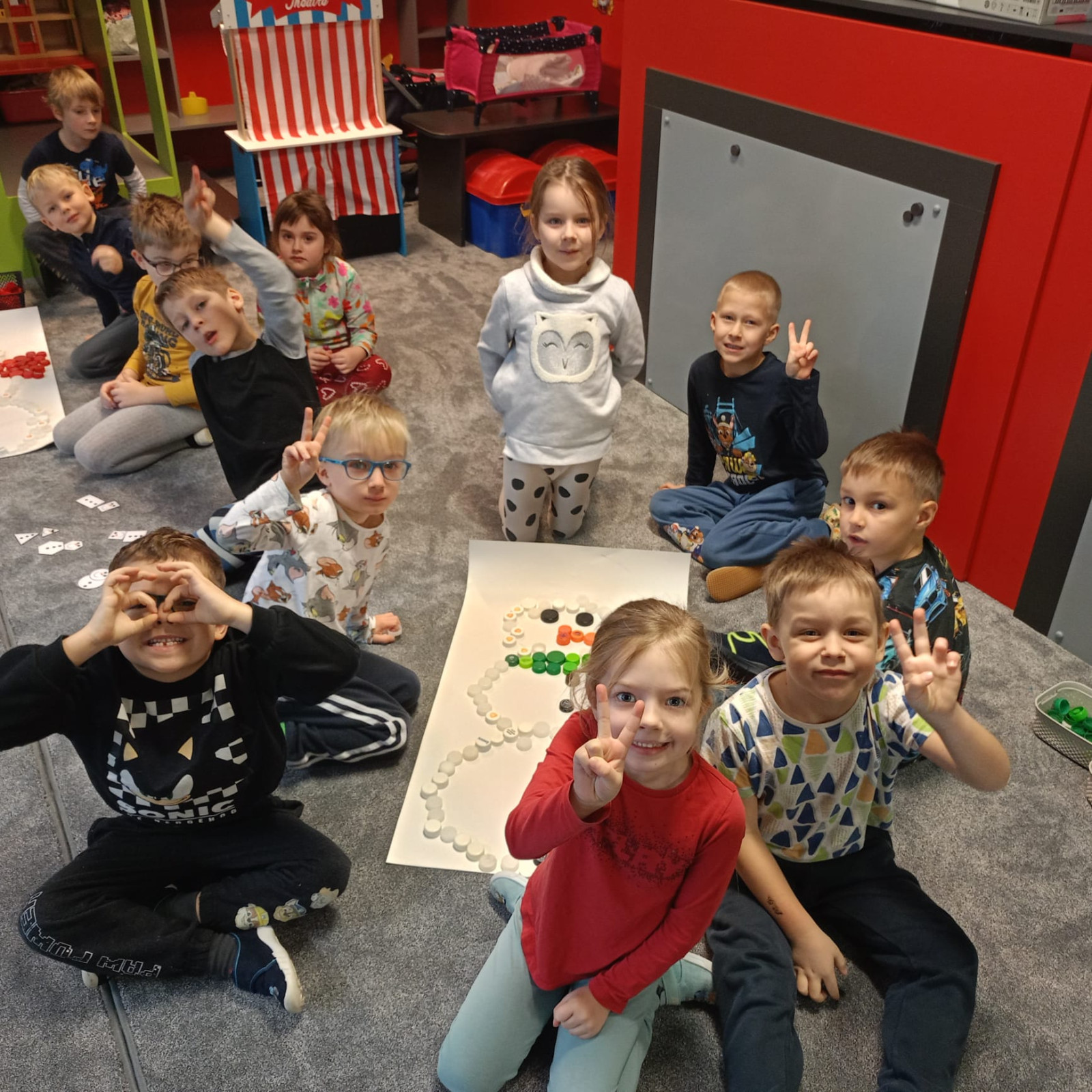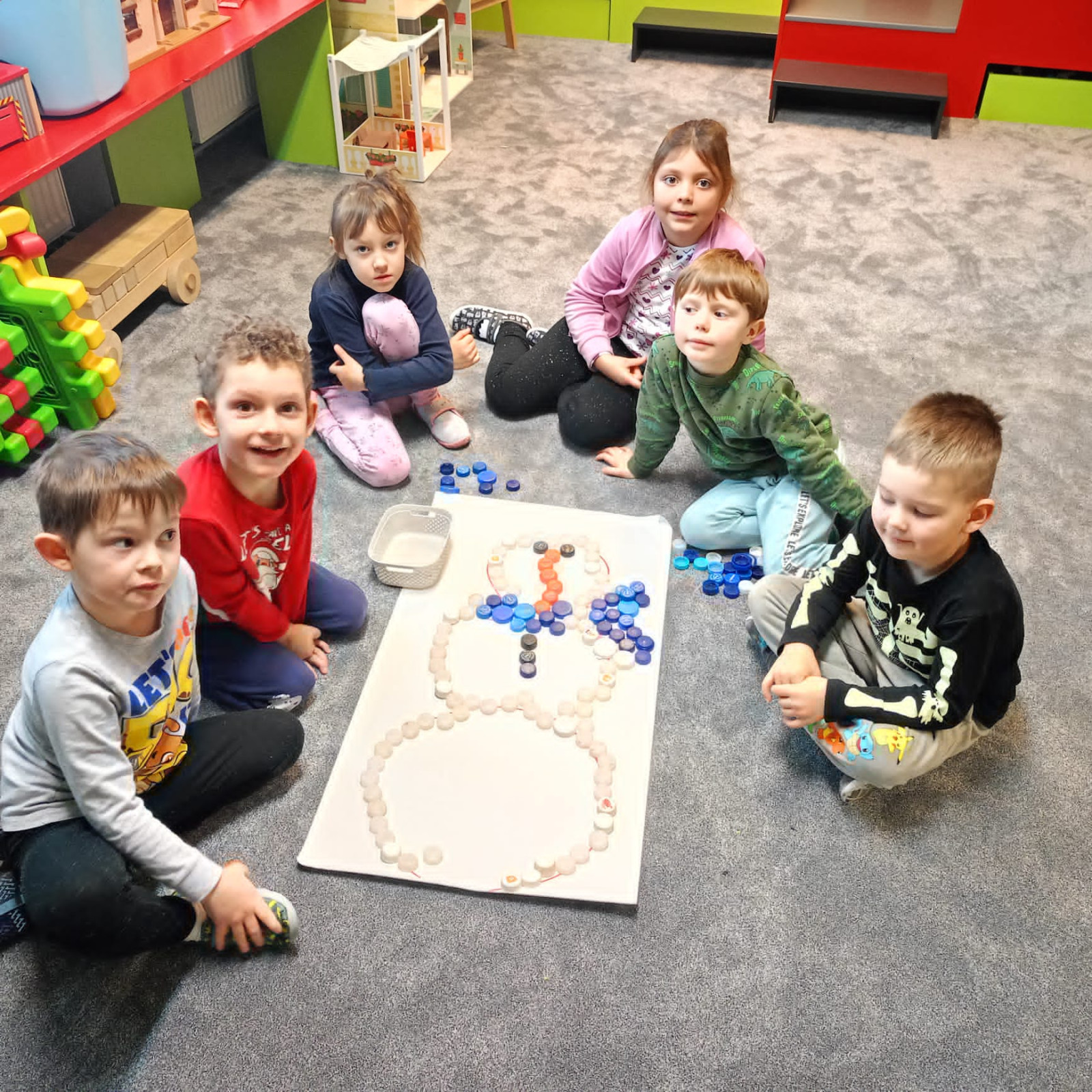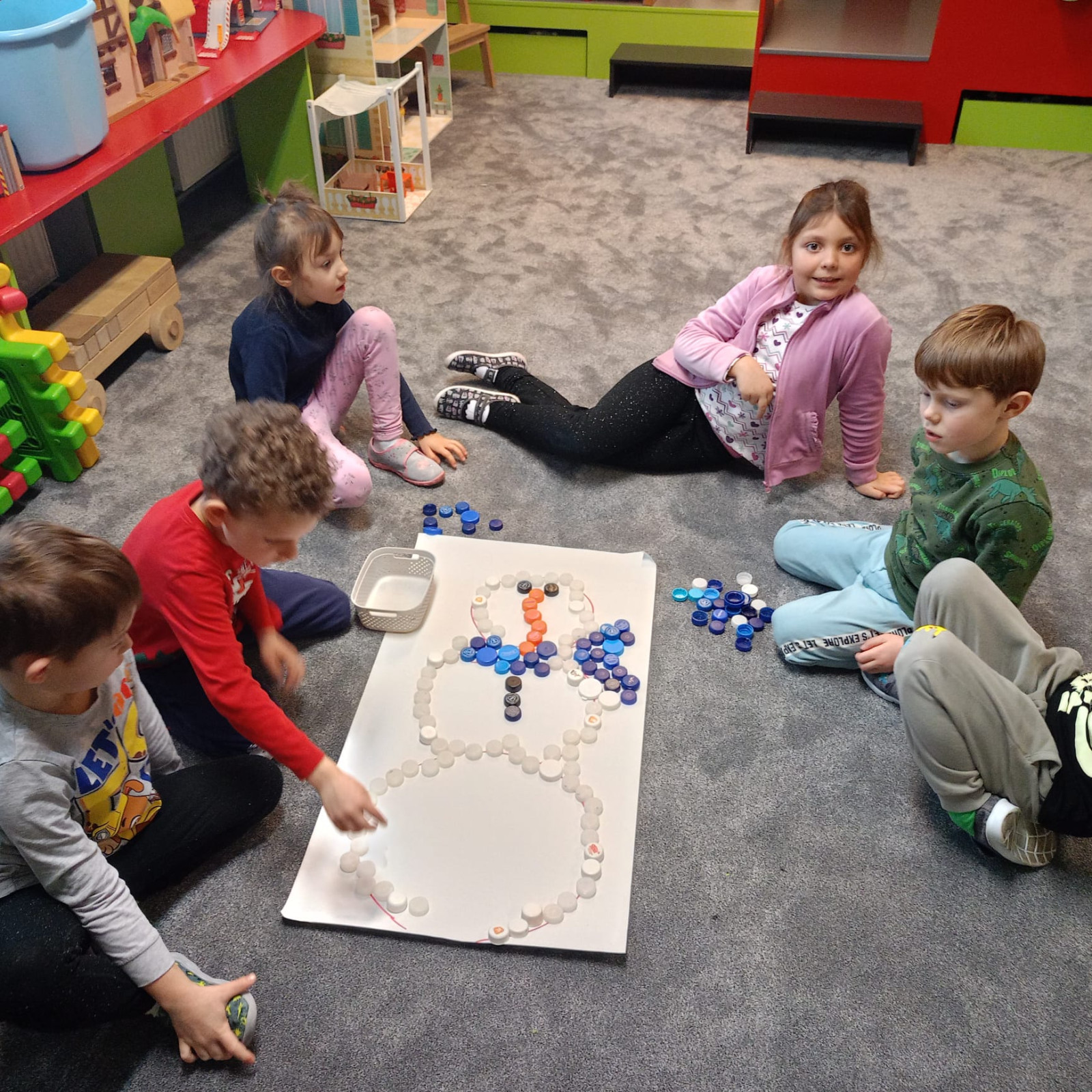 - Tento týden jsme si hráli se sněhem nejen na zahradě, ale i ve třídě. Děti procvičovaly zrakové vnímání při plnění úkolu- PL, procvičovali jemnou motoriku při skládání sněhuláků s vršky