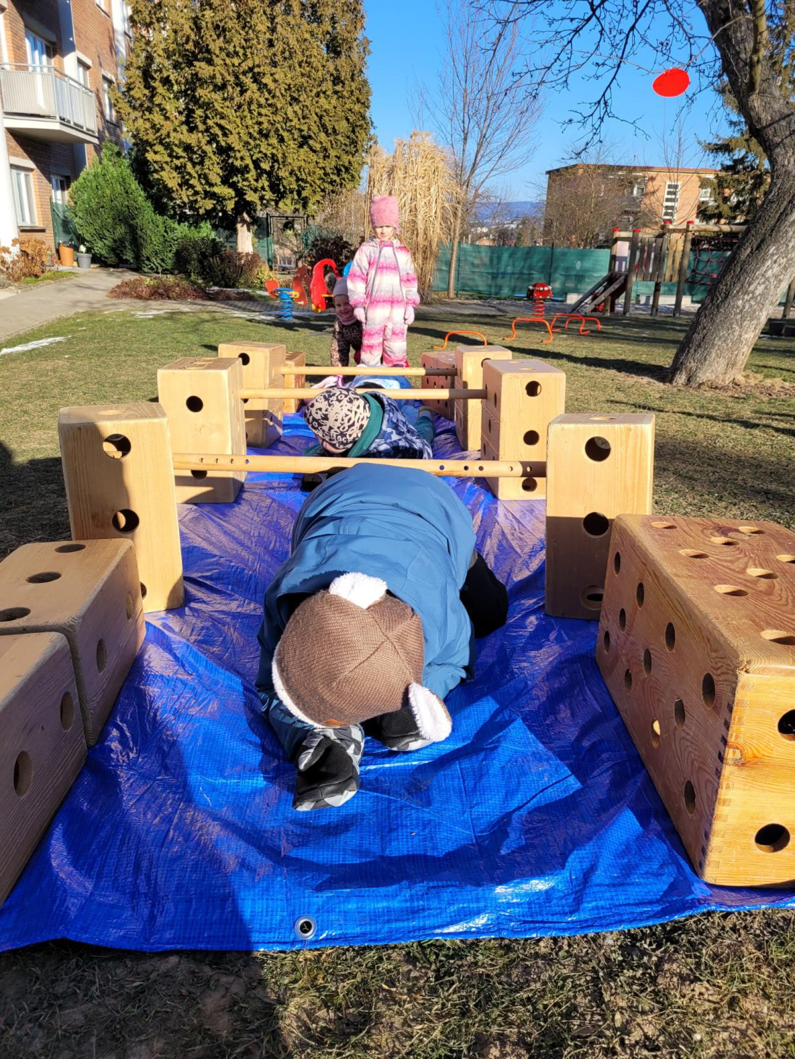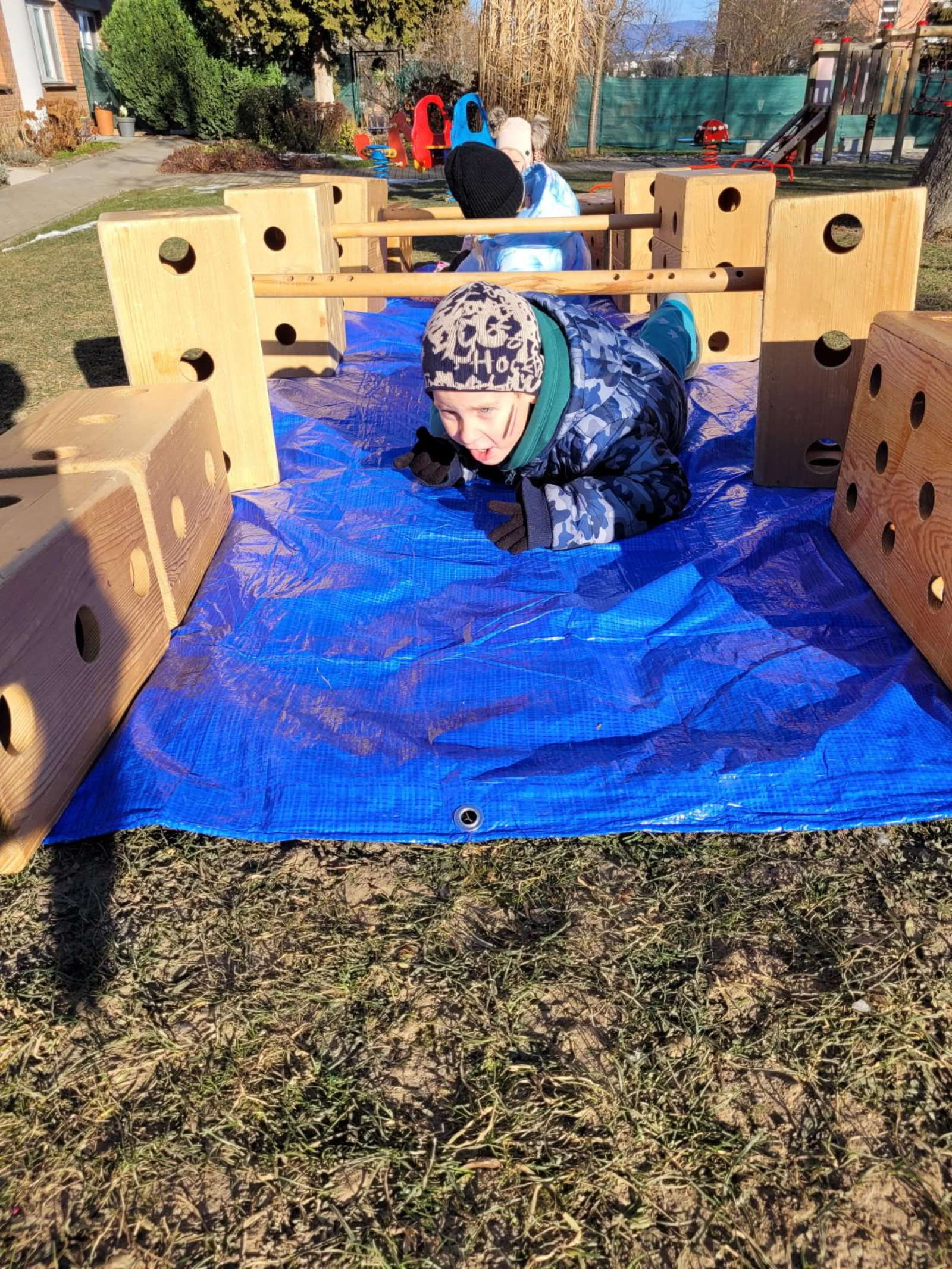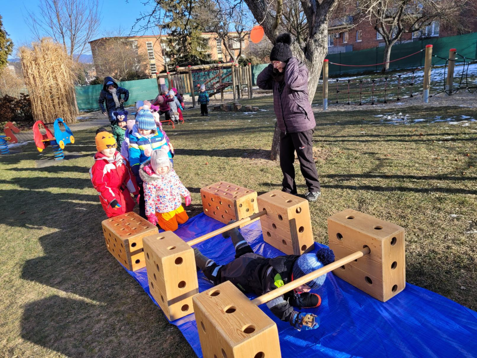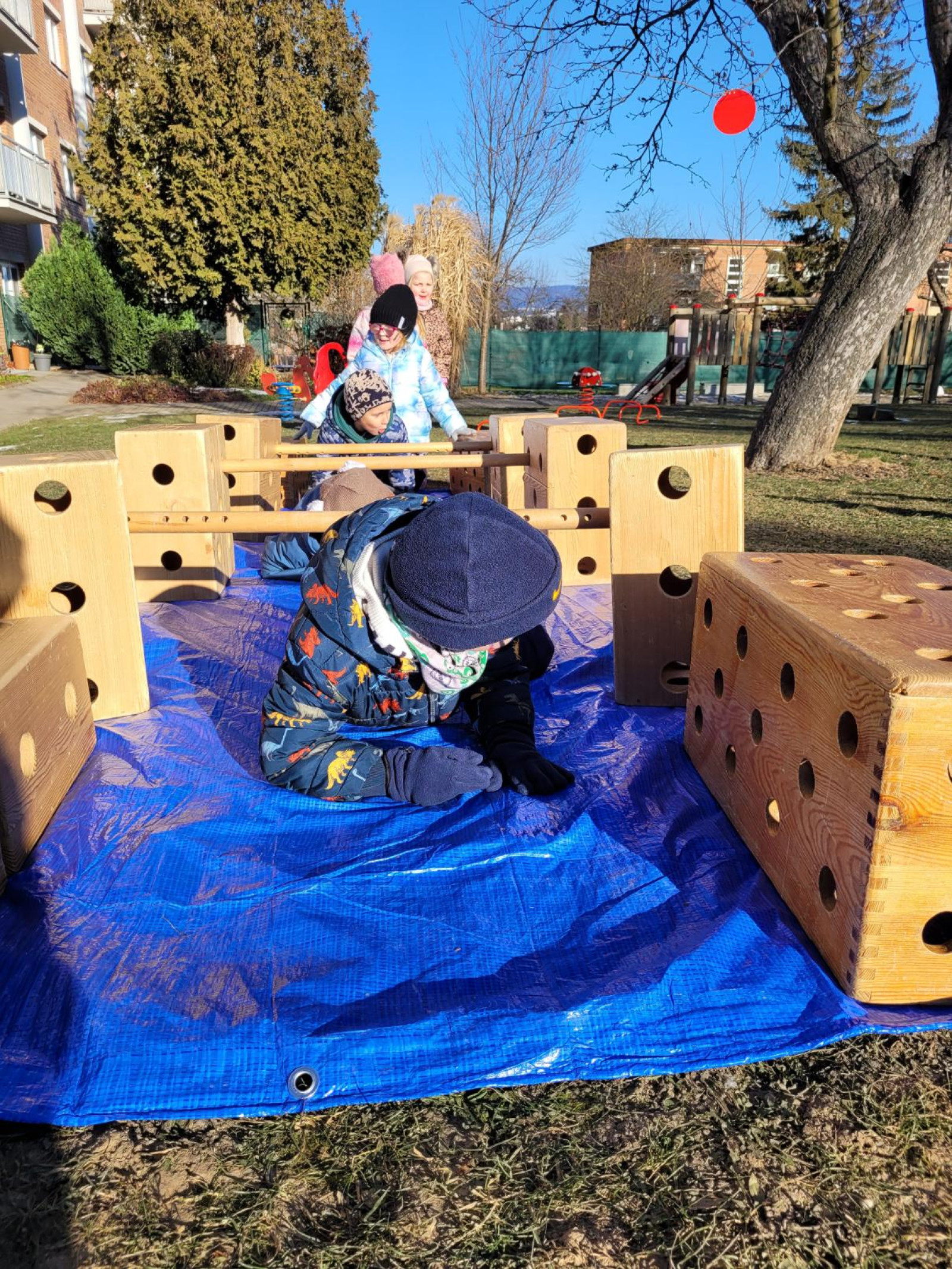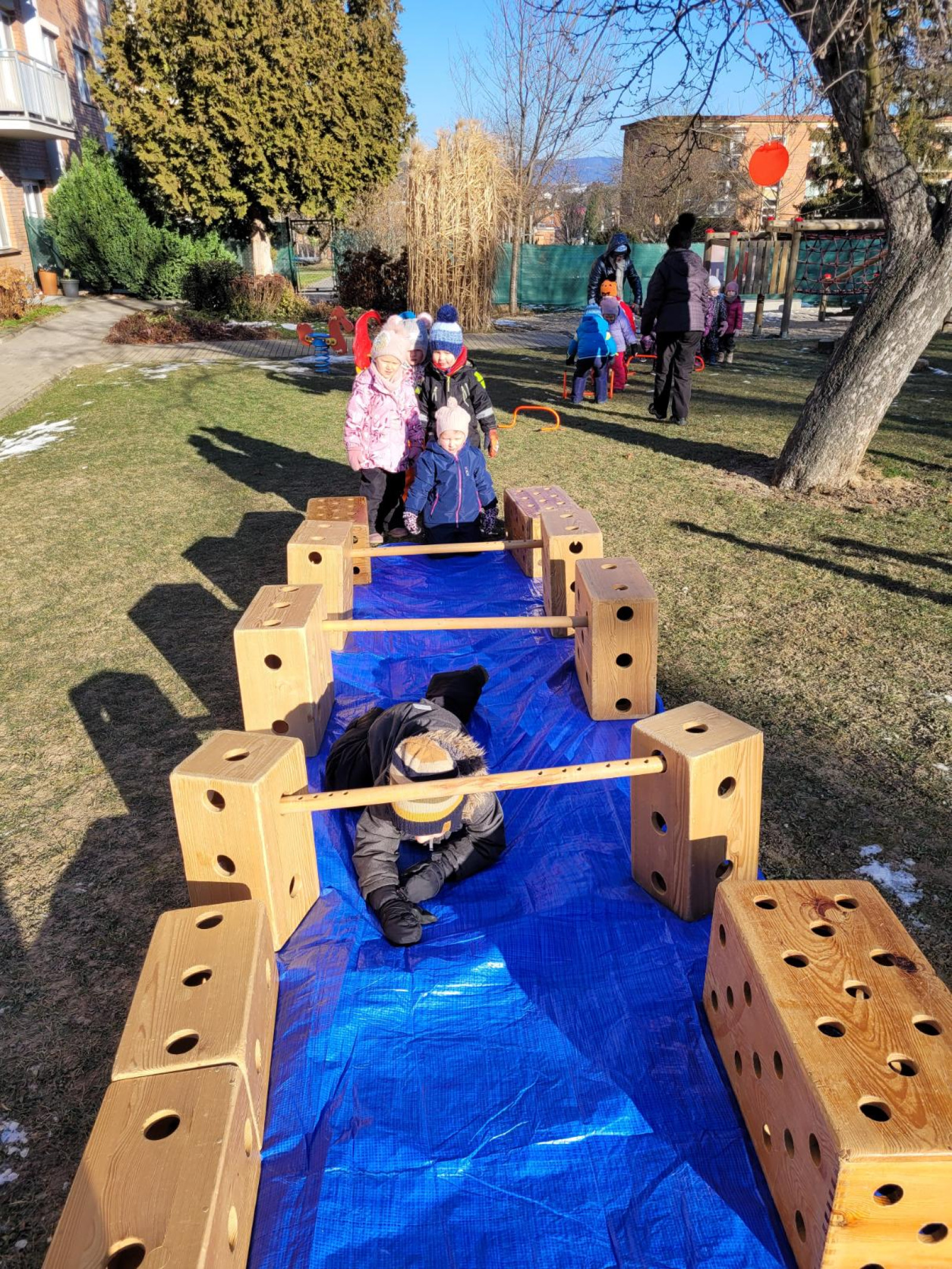 - postavili jsme z velkých kostek nový domeček, děti si hrály na rodinu, puzzle a dřevěné vkládanky, vláčkodráha, prohlíželi jsme si knihu o zvířatech (jak spí netopýři)